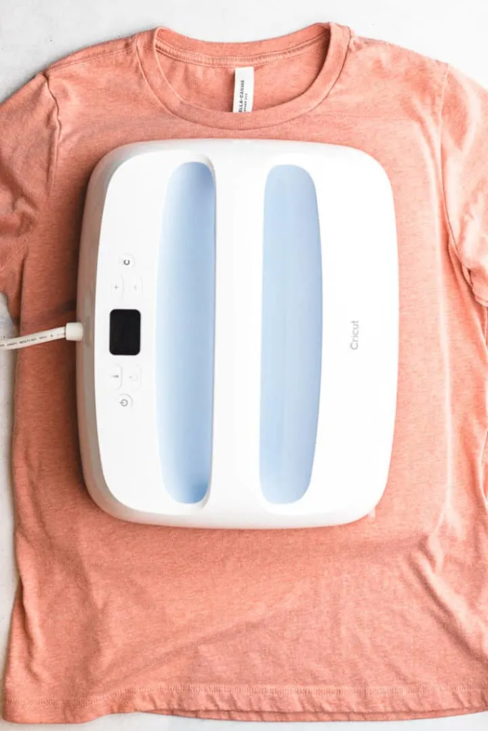 Finally, it is time to apply heat to your shirt. Lay the shirt flat on a surface and make sure there are no wrinkles. Next, place the iron-on vinyl design on the shirt. Before applying heat, preheat your EasyPress machine by setting the temperature in the Cricut app and allowing the machine to heat up. Once heated, place the EasyPress on the design and shirt, applying pressure for about 30 seconds. Now, this process will transfer the design onto your t-shirt.